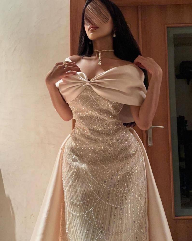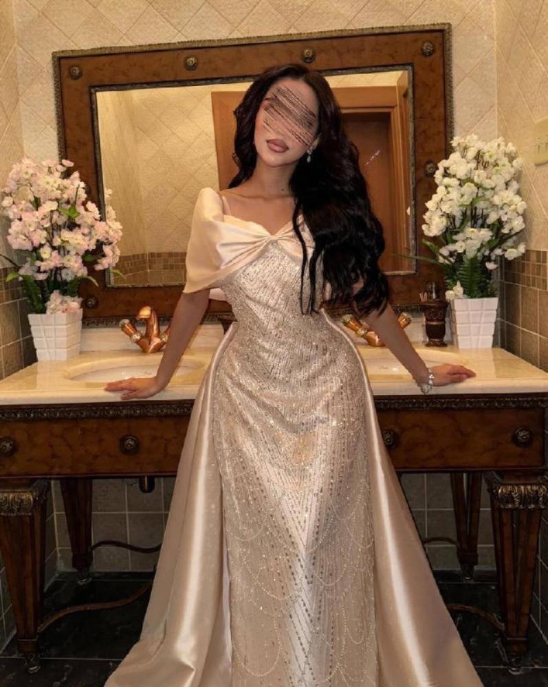 فستان فاخر بتصميم ملكي يعكس الأناقة والرقي في كل تفاصيله. مصنوع بلون شامبين جذاب يضفي لمسة من الفخامة والتميز، مع قصة انسيابية راقية تبرز القوام برشاقة. الجزء العلوي يتميز بكتف مائل يزينه شريط حريري عريض على شكل عقدة فنية تمنح إطلالة ملكية آسرة. أما القماش المطرز بالخرز والكريستال اللامع فيتناثر بشكل هندسي متقن ليعكس الضوء بلمعان أخاذ، فيما ينسدل القماش الساتاني الفاخر من الخلف ليضفي حضورًا دراميًا يليق بأرقى المناسبات.
