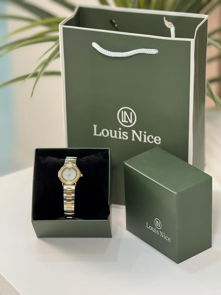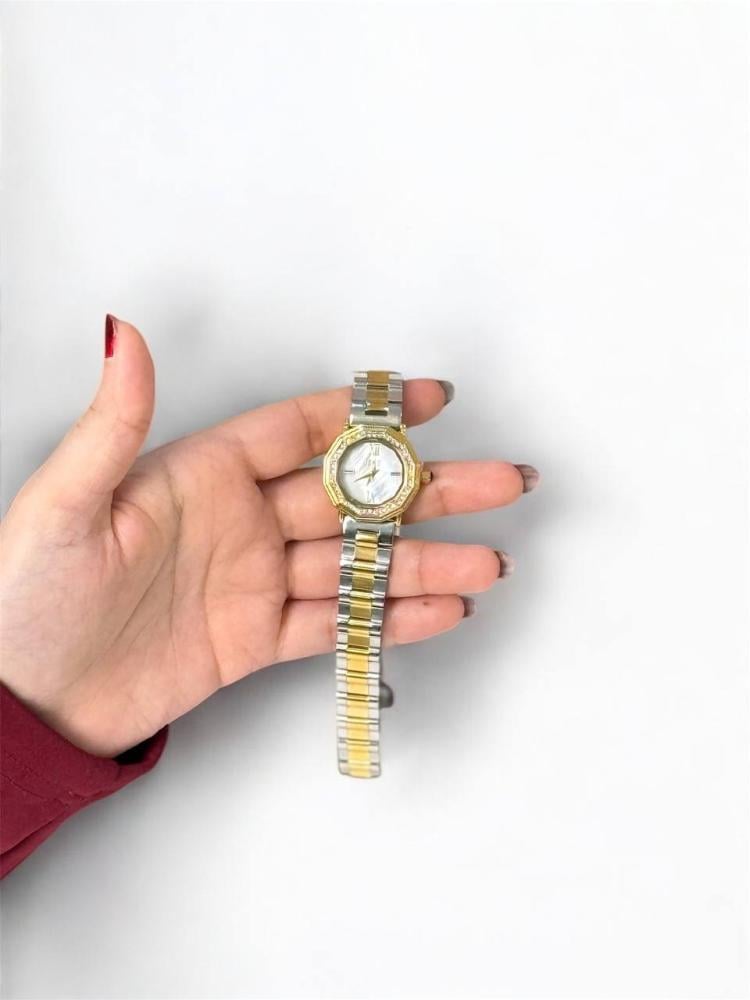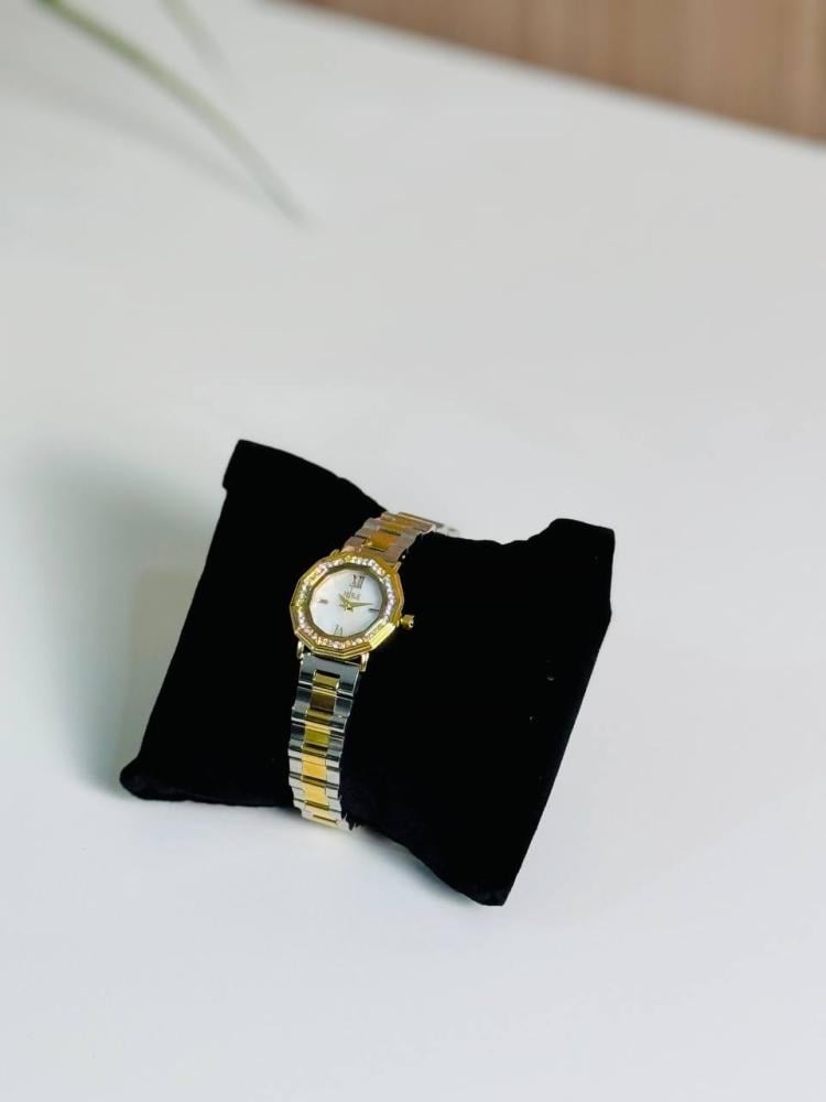 تتألق الساعة بإطار مثمّن الشكل مطليّ باللون الذهبي، يحيط به صف من الكريستالات البراقة التي تضيف لمسة من الفخامة والأنوثة. المينا باللون الأبيض اللؤلؤي الهادئ، مزوّدة بعقارب ذهبية أنيقة تمنحها مظهراً راقياً ومتناغماً.