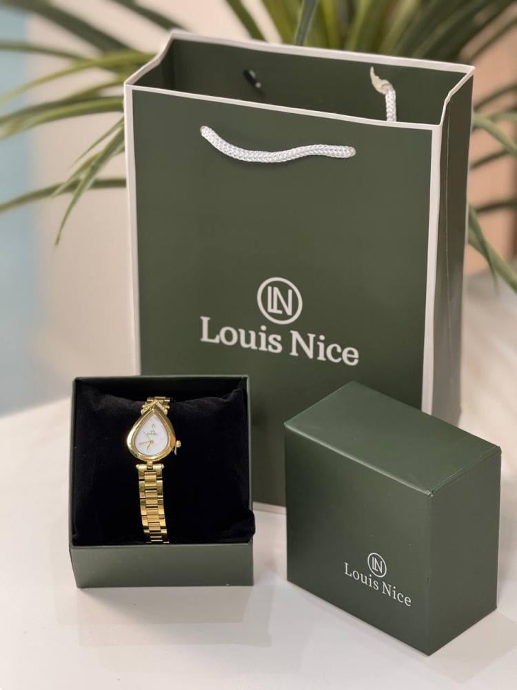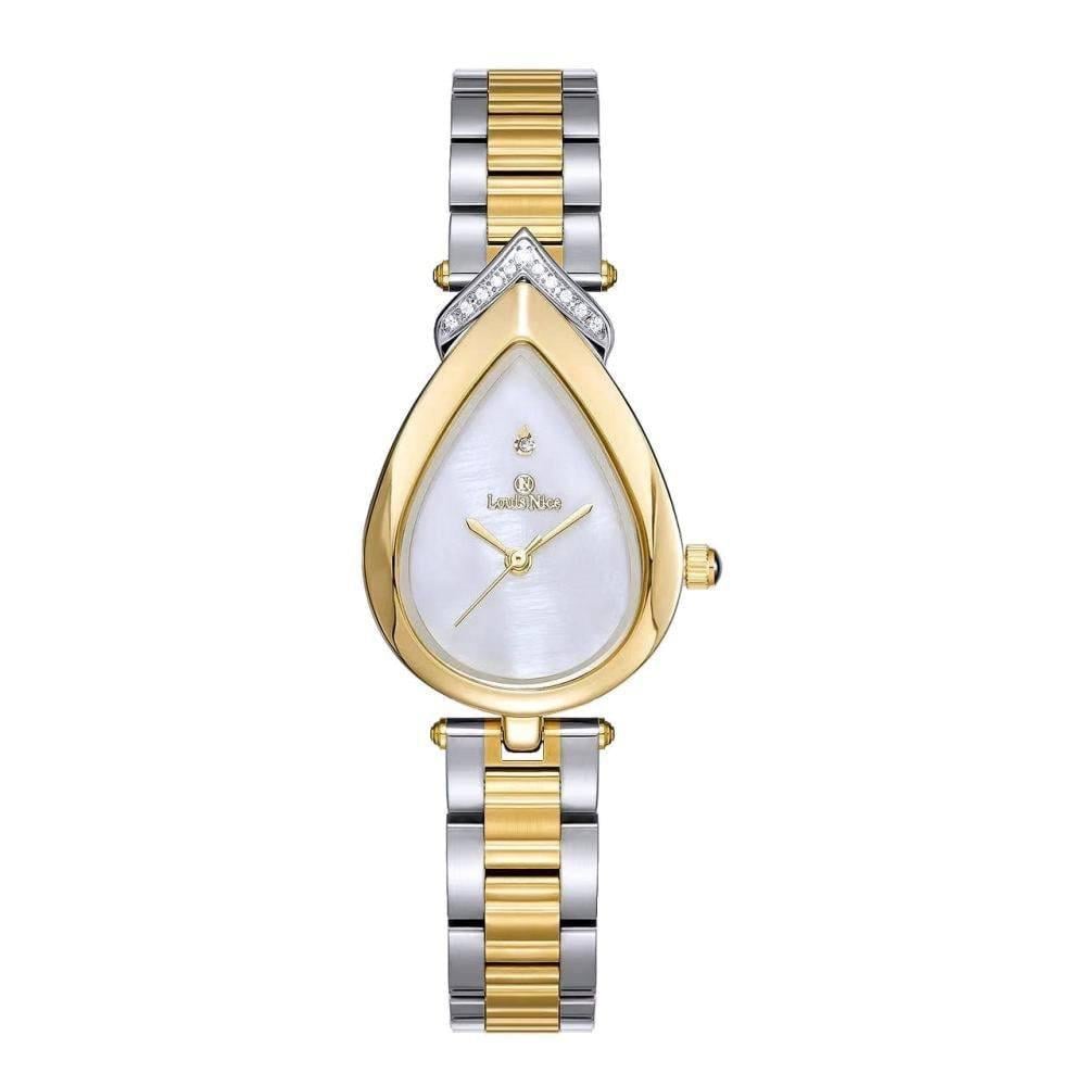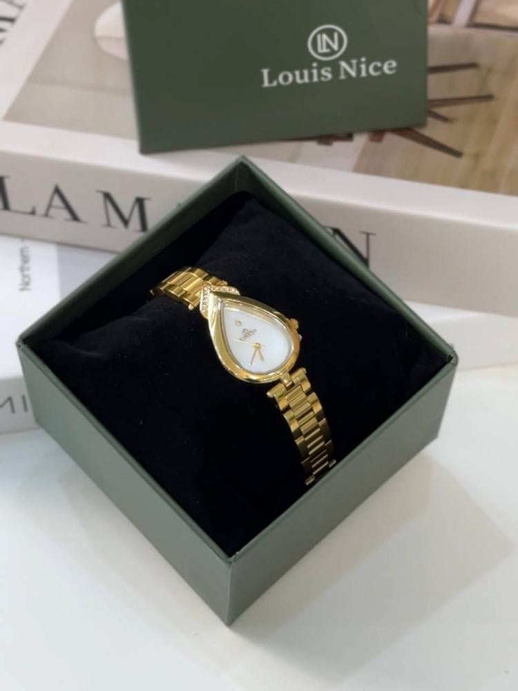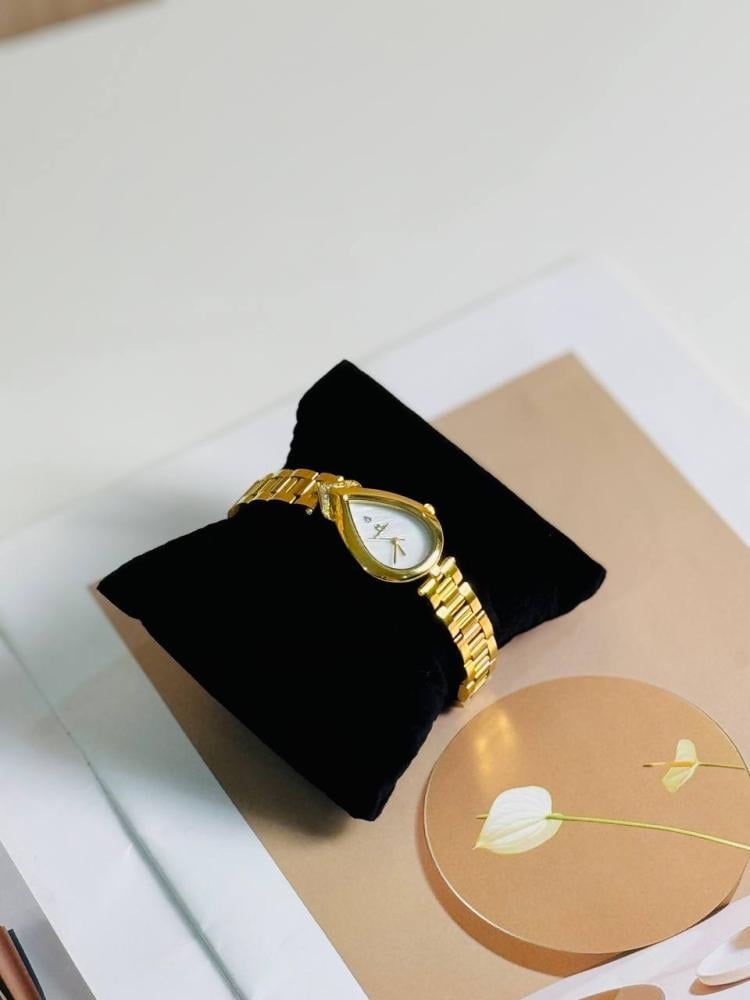تتألق الساعة بتصميم استثنائي على شكل قطرة ماء، يمنحها طابعاً ناعماً ومميزاً يعكس الإبداع في أدق تفاصيله. الإطار الذهبي اللامع يحيط بمينا بيضاء ناعمة بلمسة لؤلؤية تضفي إشراقة أنيقة تشبه ضوء الفجر على سطح الماء. العقارب الذهبية الدقيقة تضيف لمسة من الانسيابية والتناسق، مما يجعلها قطعة فنية قبل أن تكون ساعة.